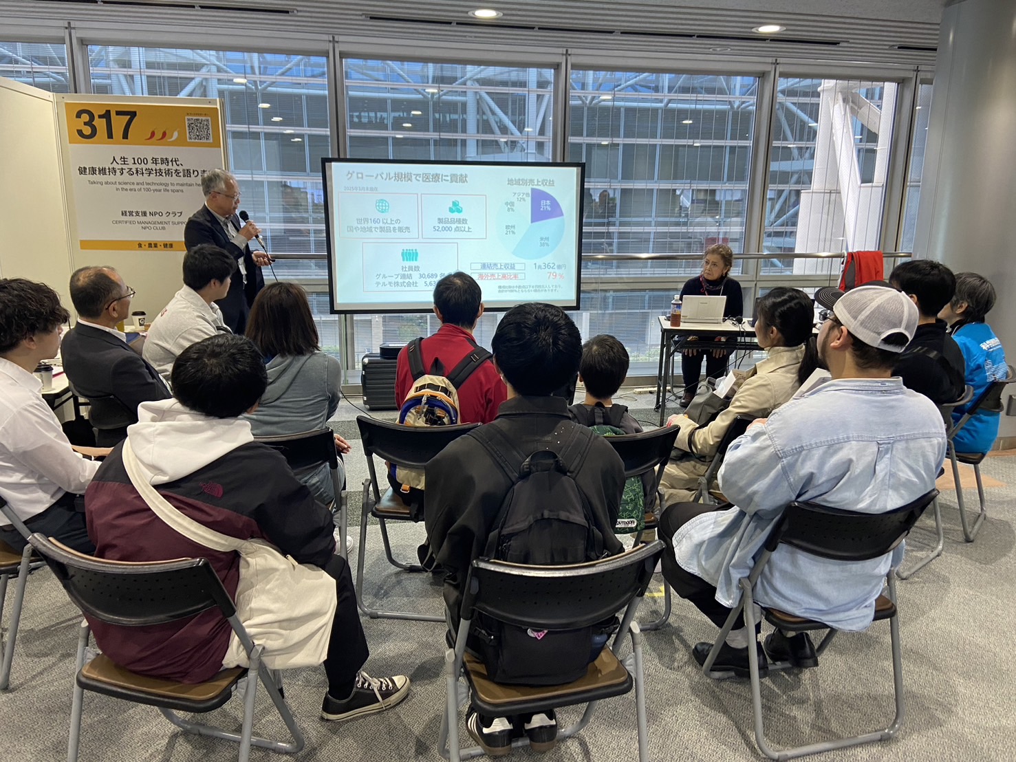 経営支援NPOクラブは多様な経験や知見を持つ実務家が出身企業の業種別にチームを作り、主に中小企業を対象にした経営支援をしています。そして、今年のサイエンスアゴラでは10月25日と26日二日間に製薬会社、医療機器メーカー出身のヘルスケアグループの実務家7人が「人生100年時代、健康維持する科学技術を語ります」の企画テーマを、それぞれの専門分野から現状と未来について6回のセミナーを実施しました。全てのセミナーで講師は「健康維持する科学技術」の現状と未来についてわかりやすく参加者に語りかけました